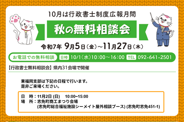 福岡県行政書士会は 市民相談センター ・ 外国人無料相談会 ・ 各種営業許可等の申請相談 ・ 交通事故無料相談会 を実施しています。